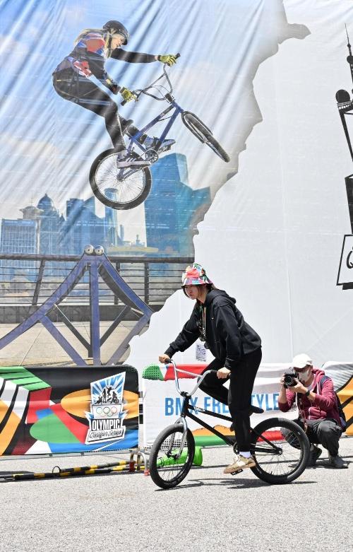 在16日的体验环节前,钟天使就抢先体验了自由式小轮车项目,做出了几个技术动作。虽然同属自行车大项,小轮车和场地自行车的比赛用车还是有很大不同。她表示,在小轮车上完成这样的动作,确实是全新的体验。
