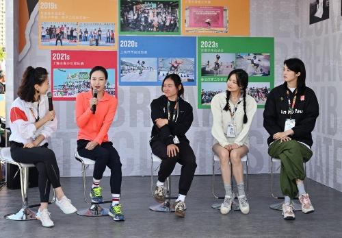 5月16日,嘉宾吴敏霞(左二)、钟天使(中)、黄龄(右二)、赵丽娜(右一)参加访谈活动。新华社记者 陶希夷 摄