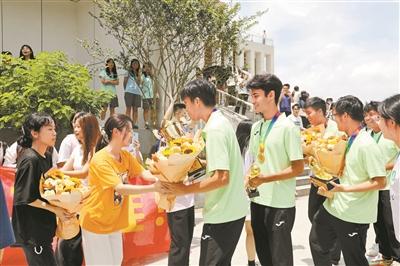 队员们收到师生送上的鲜花。