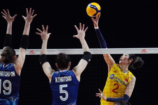 6月1日,中国队球员朱婷(右)在比赛中扣球。当日,在澳门银河综艺馆举行的世界女排联赛中国澳门站比赛中,中国队3比0战胜泰国队。新华社记者 吕小炜 摄