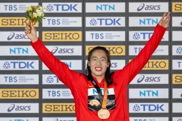2023年8月23日,2023世界田径锦标赛女子铁饼颁奖仪式在匈牙利布达佩斯举行,季军中国选手冯彬在颁奖仪式上。新华社记者 孟鼎博 摄