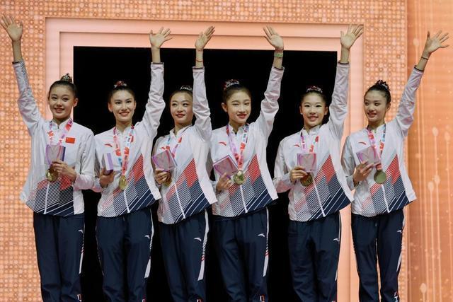 2023年8月27日,中国队选手在颁奖仪式上。当日,在西班牙巴伦西亚举行的2023世界艺术体操锦标赛集体5圈决赛中,由郭崎琪、郝婷、王澜静、蒲彦竹、丁欣怡组成的中国队以36.550分获得5圈单项金牌,这是中国艺术体操队首次获得世界冠军。新华社发(帕布罗·莫拉诺 摄)