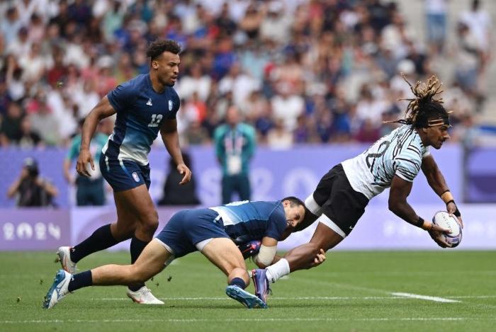 7月25日,斐济队球员瑟雷斯蒂诺(右)在比赛中拼抢。当日,在巴黎奥运会七人制橄榄球男子分组循环赛C组比赛中,斐济队19比12战胜法国队。新华社记者陶希夷 摄
