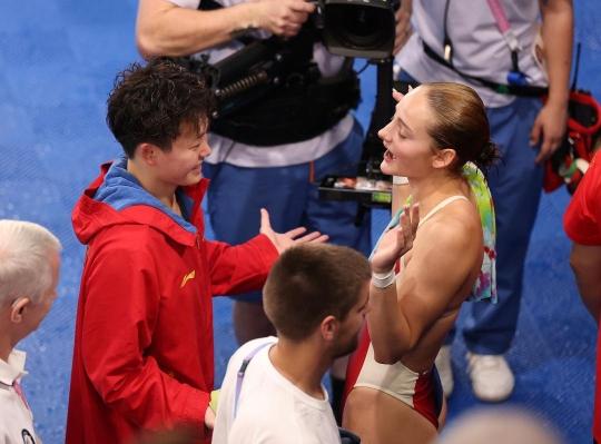 7月27日,中国选手陈艺文(中左)与参赛选手交流。