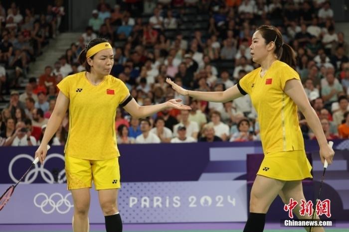 当地时间7月30日,陈清晨/贾一凡(右)在比赛中相互鼓励。当日,在巴黎奥运会羽毛球项目女子双打小组赛比赛中,中国组合陈清晨/贾一凡2比0战胜日本组合松本麻佑/永原和可那,晋级淘汰赛。中新社记者 富田 摄