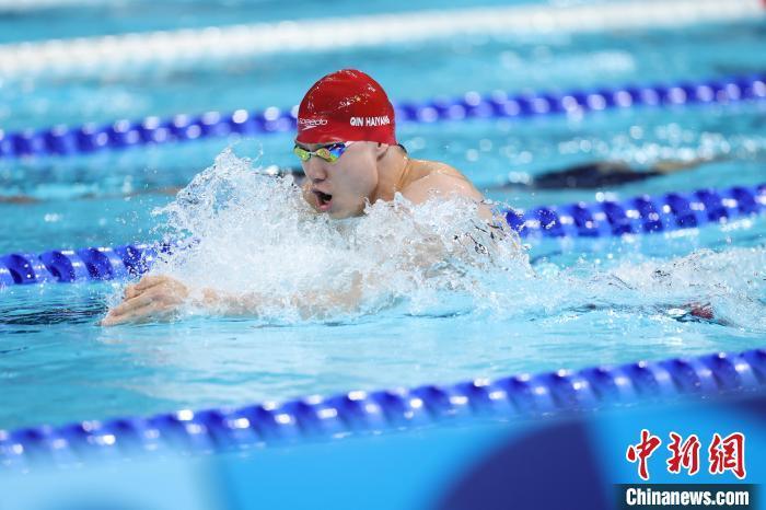 当地时间7月28日,在巴黎奥运会游泳男子100米蛙泳决赛中,中国选手覃海洋游出59秒50的成绩,获得第七名。图为覃海洋在比赛中。中新社记者 富田 摄
