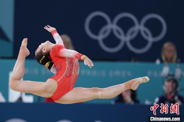 30日,在巴黎奥运会竞技体操女子团体决赛中,由罗欢、欧钰珊 、邱祺缘、张怡涵和周雅琴组成的中国队以162.131分的总成绩获得第六名。图为周雅琴在自由操比赛中。中新社记者 盛佳鹏 摄