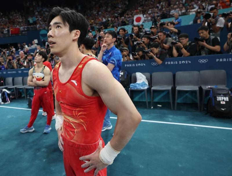 7月31日,中国选手张博恒在单杠比赛后等待成绩。新华社记者 曹灿 摄