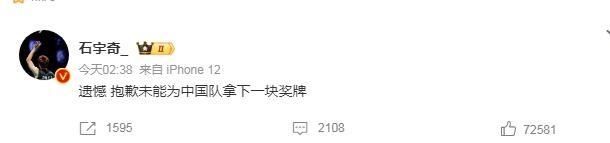 石宇奇赛后表示,输球感到很难受,但也只能接受。他也在社交平台发文道歉,“遗憾,抱歉未能为中国队拿下一块奖牌”。