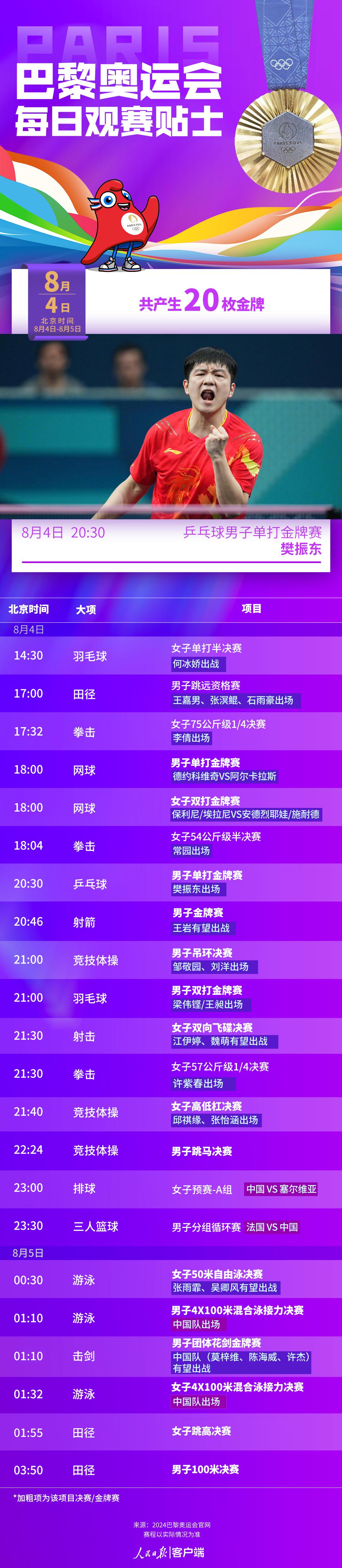 巴黎时间8月4日,巴黎奥运会将在乒乓球、羽毛球、网球、竞技体操、游泳、田径等项目产生20块金牌。樊振东向自己的首个奥运男单冠军发起冲击,“梁王”组合奔赴决赛赛场,东京奥运会吊环冠军刘洋挑战卫冕。田径方面,将上演备受瞩目的男子百米“飞人大战”。这些看点值得关注。