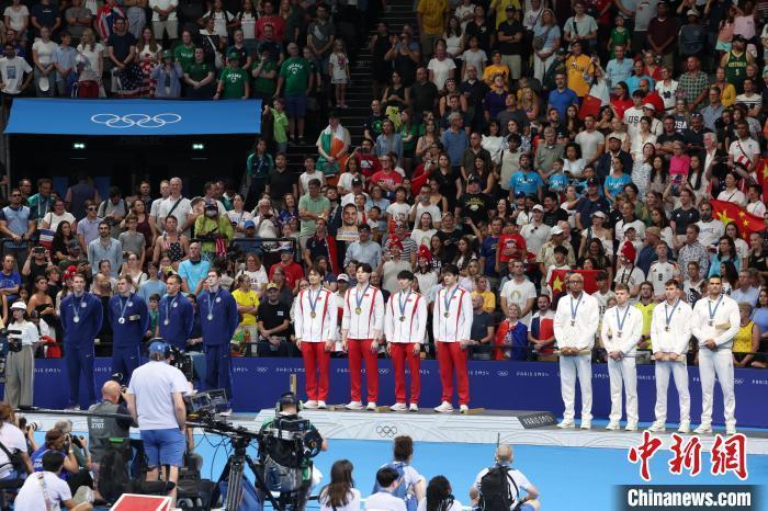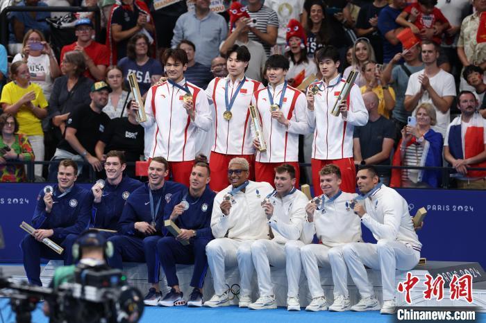 当地时间8月4日,在巴黎奥运会游泳项目男子4x100米混合泳接力决赛中,由徐嘉余、覃海洋、孙佳俊、潘展乐组成的中国队夺得金牌。图为中国队(中)在颁奖仪式上。中新社记者 富田 摄