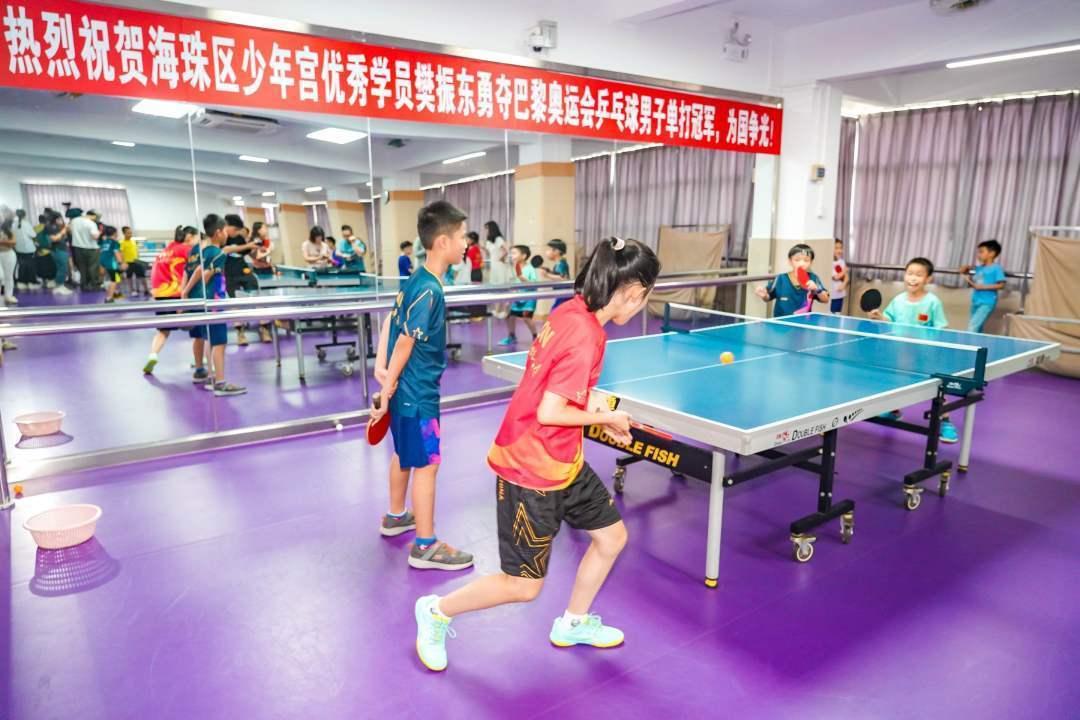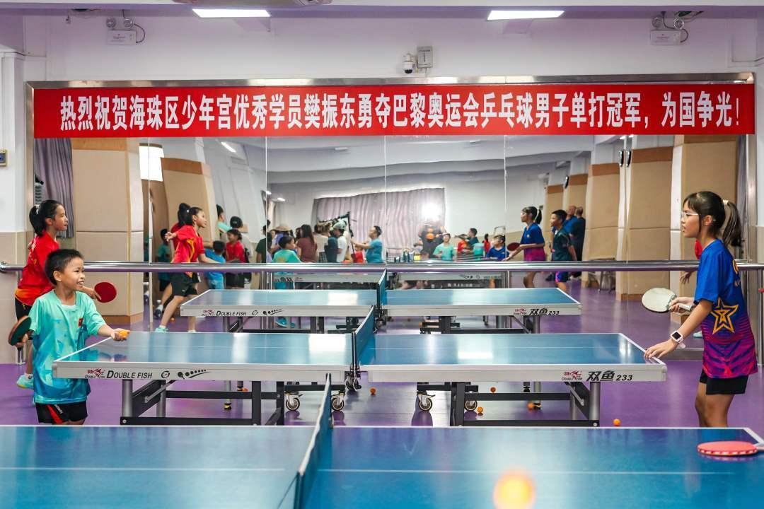 8月5日的海珠区少年宫热闹非凡,正值暑假,不少学员在此学习、练习乒乓球。当日下午,樊振东的乒乓球启蒙教练、已退休的文浩光、杨碧瑜夫妇回到了海珠区少年宫,观看、指导学员打球。