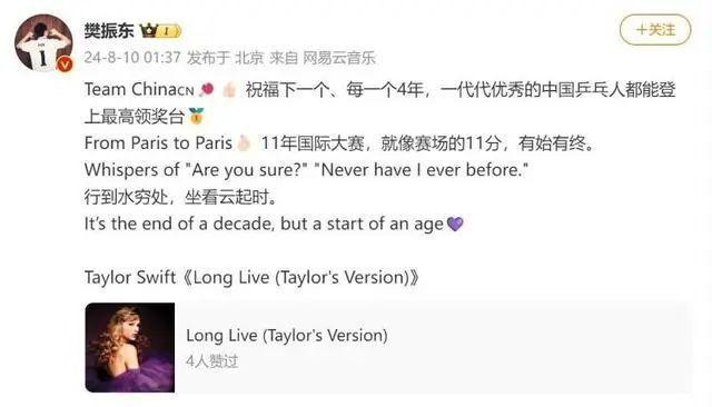 在8月9日乒乓球男团决赛战胜瑞典队后,8月10日凌晨,樊振东发文庆祝夺冠,告别了本次巴黎奥运会,并回顾了11年在国际赛场上的经历,用“有始有终”进行了概括。