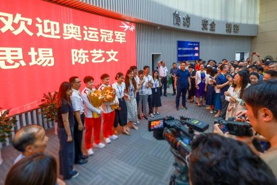 8月26日上午,巴黎奥运会跳水冠军谢思埸、陈艺文来到十五运会广东省执委会参观,与执委会工作人员互动之余,还参观了正在进行升级改造的广东奥林匹克中心游泳跳水馆,提前感受2025粤港澳全运会的氛围。