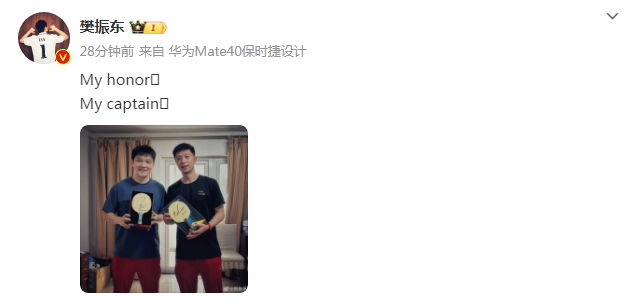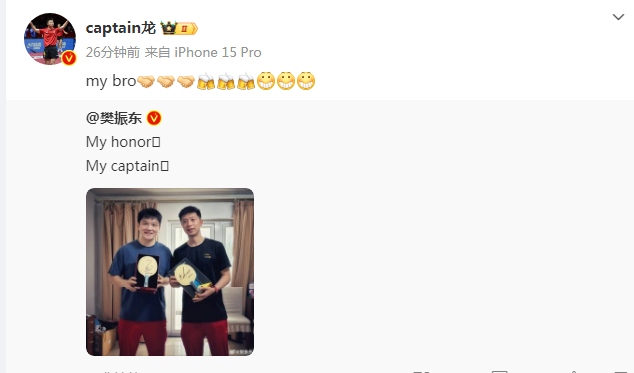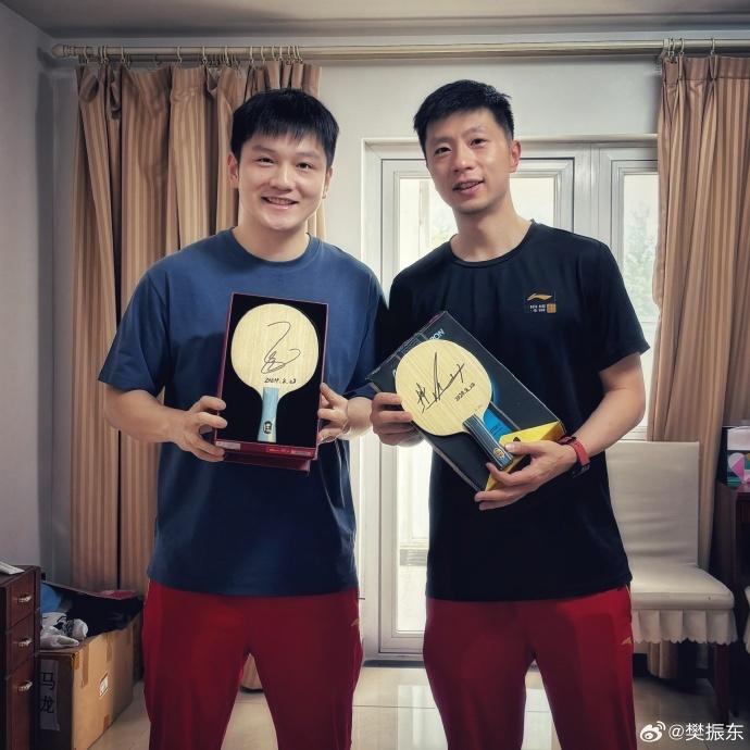 8月28日,樊振东更新微博,晒出与队友马龙的合影,两人交换了签名球拍。樊振东同时写道:“我的荣耀,我的队长。”而马龙也回复:“我的兄弟。”
