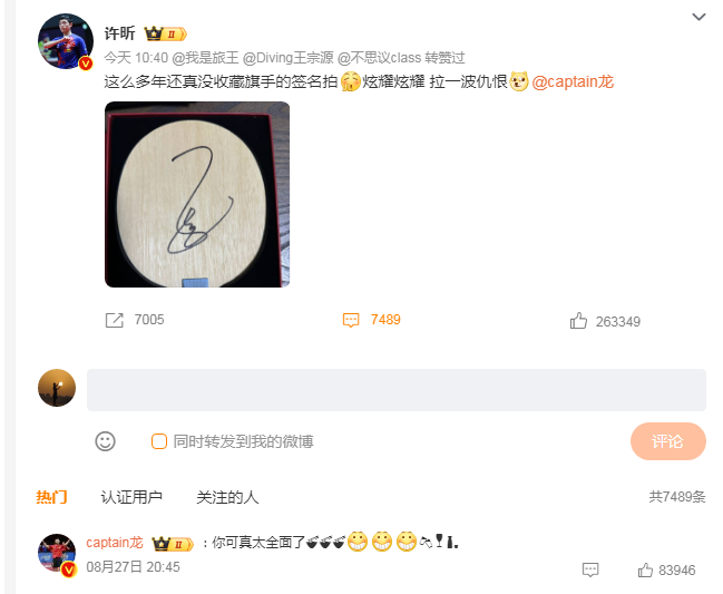 此前,@许昕 也分享了马龙的签名球拍,马龙现身评论区回复:“你可真太全面了”。