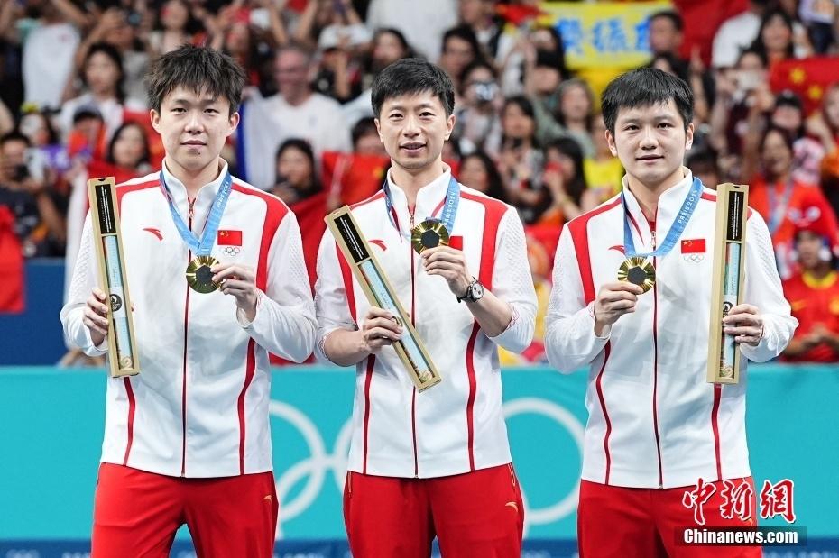 在巴黎奥运会乒乓球男团金牌赛中,中国队以3比0战胜瑞典队,获得冠军。中新社记者 赵文宇 摄
