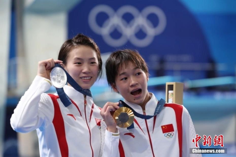 图为陈芋汐(左)、全红婵(右)展示奖牌。中新社记者 富田 摄