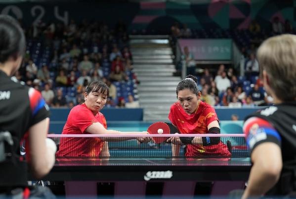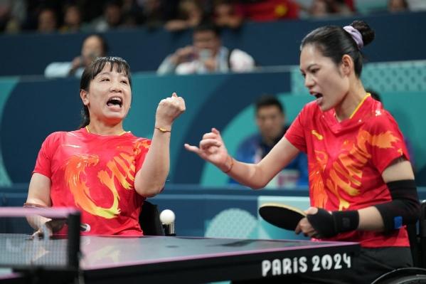 女双14级决赛上,19岁的黄文娟搭档16岁的金芋成,以3:1战胜德国组合格雷贝/沃尔夫,赢得本届残奥会乒乓球首金。随后的女双5级决赛,36岁的刘静搭档34岁的薛娟,以3:1击败韩国组合徐秀妍/尹智裕,为中国队再添一金。