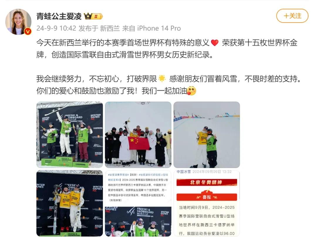 赛后,谷爱凌发文称:“今天在新西兰举行的本赛季首场世界杯有特殊的意义,荣获第十五枚世界杯金牌,创造国际雪联自由式滑雪世界杯男女历史新纪录。”