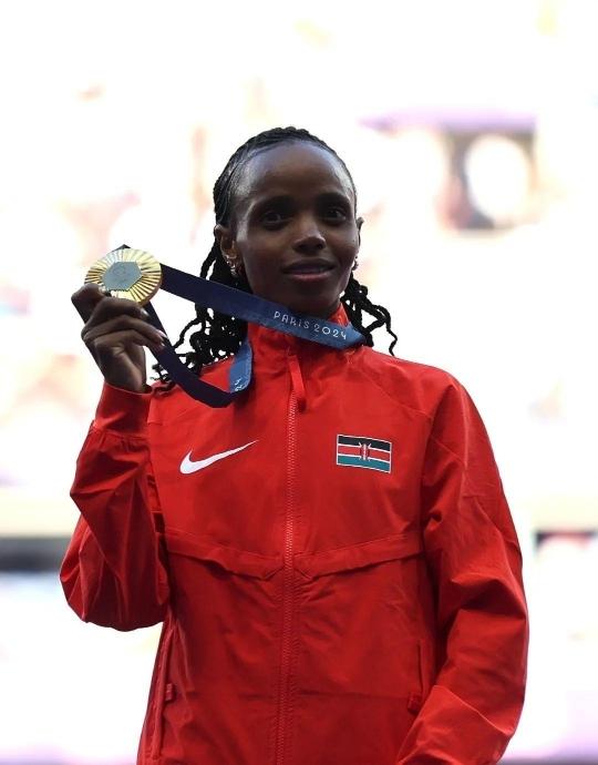 这是2024年8月6日,冠军肯尼亚选手切贝特在巴黎奥运会田径女子5000米颁奖仪式上庆祝。新华社记者 李钢 摄