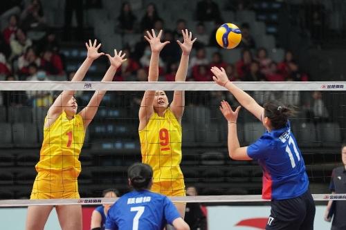 2024年11月27日,山东队球员李晨瑄(中)、李美君(左)在比赛中拦网。当日,在湖南省长沙市贺龙体育馆举行的中华人民共和国第一届青少年三大球运动会排球女子金牌赛中,山东队3比0战胜江苏队,获得冠军。新华社记者 薛宇舸 摄