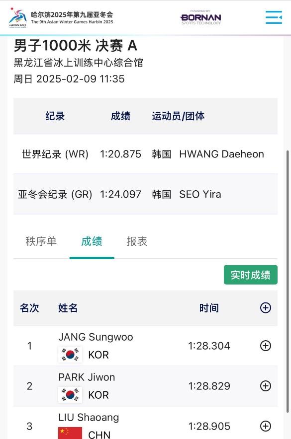 中新网哈尔滨2月9日电 在9日于黑龙江省冰上训练中心综合馆举行的哈尔滨亚冬会短道速滑男子1000米A组决赛中,中国选手刘少昂以1分28秒905的成绩获得铜牌。冠亚军由两位韩国选手包揽。中国选手孙龙在冲刺阶段意外摔倒无缘领奖台。