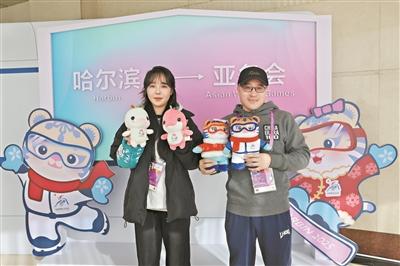 哈尔滨日报记者刘珂(左)、广州日报记者白志标分别手持十五运会、亚冬会吉祥物合影。广州日报全媒体记者杨泽彬摄