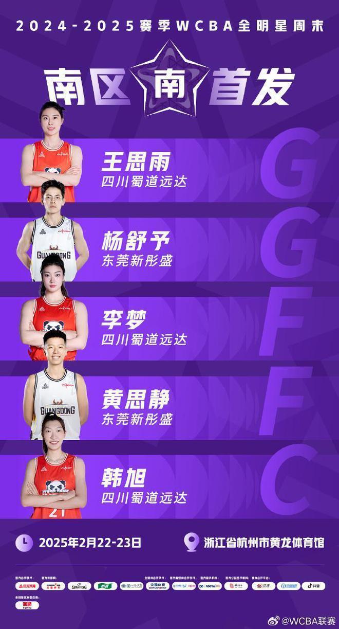 WCBA官方正式公布了2024—2025赛季WCBA全明星正赛完整阵容。广东女篮有杨舒予、黄思静、杨力维三人入选南区全明星队;而卫冕冠军四川队的3位核心王思雨、李梦与韩旭均入选首发阵容,王思雨成为票王。