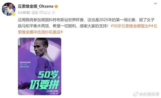 即将年满50岁的体操名将丘索维金娜在个人社交媒体上宣布复出,她将参加于当地时间2月20日开赛的体操世界杯科特布斯站。