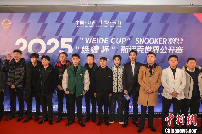 图为中国知名斯诺克运动员丁俊晖(图左二)出席2025“维德杯”斯诺克世界公开赛开幕式。中新社记者 刘力鑫 摄