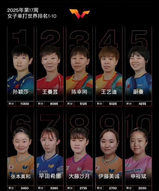 女单方面,孙颖莎以11300的高分继续断层领先,高居榜首。王曼昱6065分排名第二,陈幸同、王艺迪分列三、四位。上周获得世界杯女单亚军的蒯曼升至第五,创生涯新高。女单第6-9位均为日本选手,依次是:张本美和、早田希娜、大藤沙月和伊藤美诚。韩国选手申裕斌排名第10。