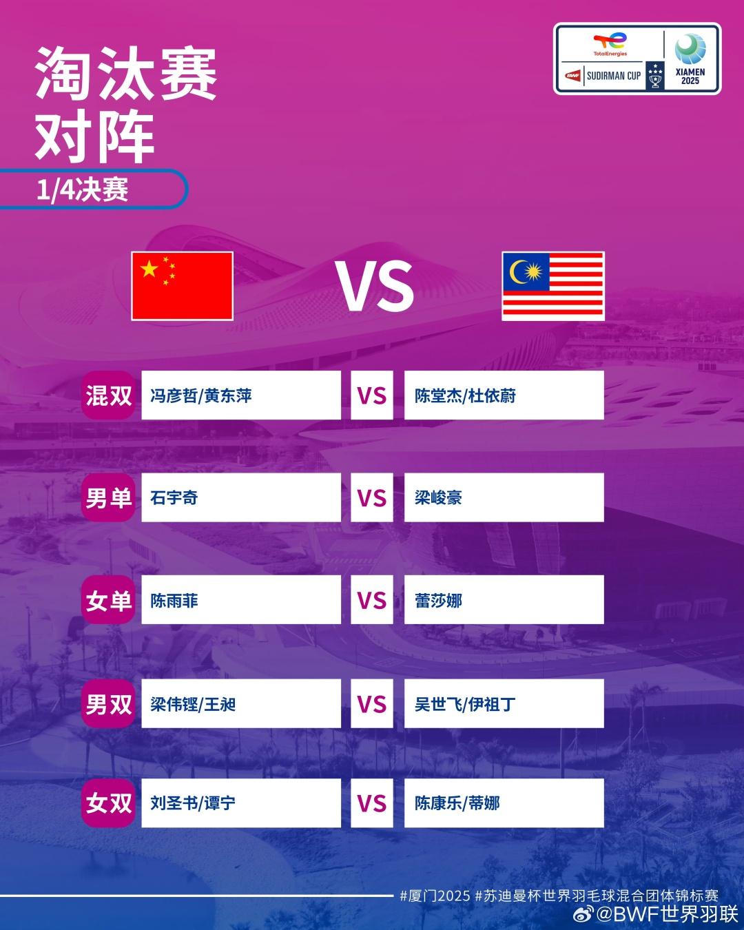 5月2日,2025年苏迪曼杯世界羽毛球混合团体锦标赛在厦门进入淘汰赛阶段。在刚刚结束的一场1/4决赛中,中国队以3:0战胜马来西亚队,率先闯入半决赛。
