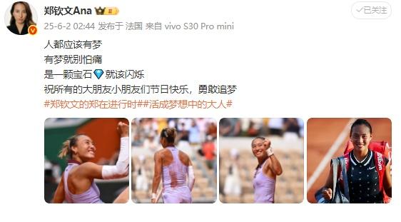 赛后,郑钦文在社交媒体发文“人都应该有梦,有梦就别怕痛,是一颗宝石就该闪烁”,并“祝所有的大朋友小朋友们节日快乐,勇敢追梦”。