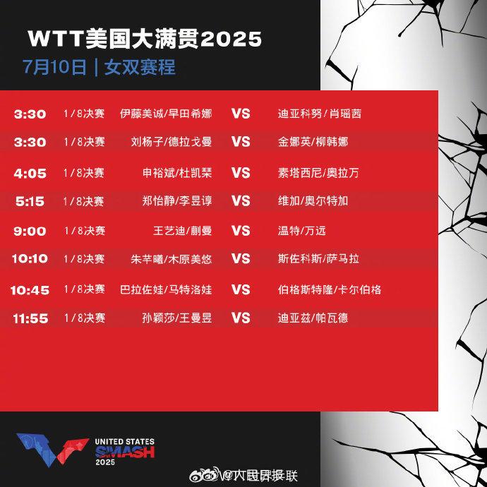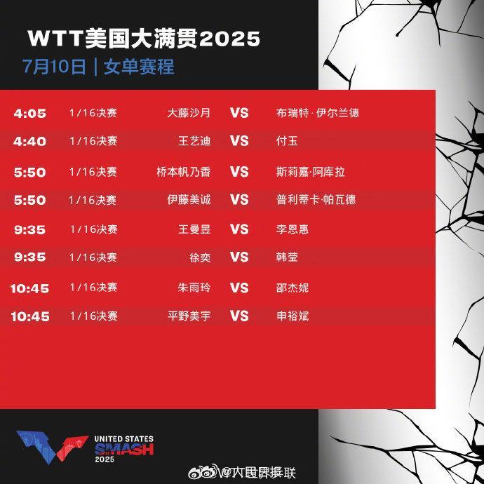 7月10日,在WTT美国大满贯,国乒迎来10场比赛。分别是: