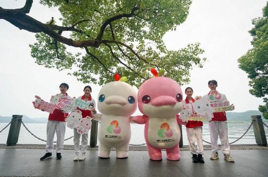 西湖之畔吉祥物“圈粉” 市民为十五运加油