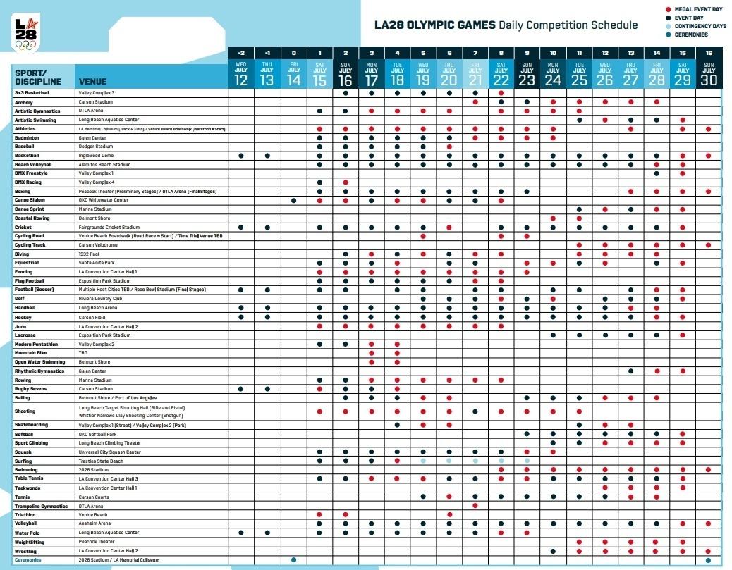 当地时间7月14日,在2028年洛杉矶奥运会倒计时三周年到来之际,组委会公布了竞赛日程。