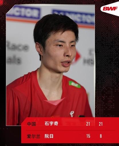 男单方面,国羽三人全部取胜。3号种子石宇奇以21:15、21:8战胜爱尔兰选手阮日,李诗沣以21:17、21:9击败中国香港队的伍家朗。四分之一决赛两人将捉对较量。
