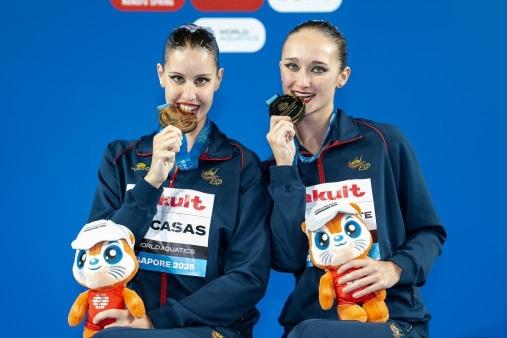 在24日进行的新加坡游泳世锦赛花样游泳女子双人自由自选比赛中,西班牙组合瓦莱特/卡萨斯夺得金牌,意大利选手皮科利/鲁杰罗、来自俄罗斯的中立运动员组合多罗什科/盖达伊分获第二、三名。中国队选手林彦含/林彦君排名第四。