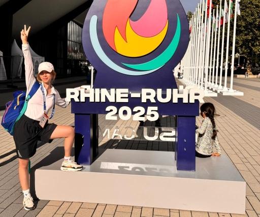 图为俞董倩与德国莱茵-鲁尔大运会会徽合影画面。