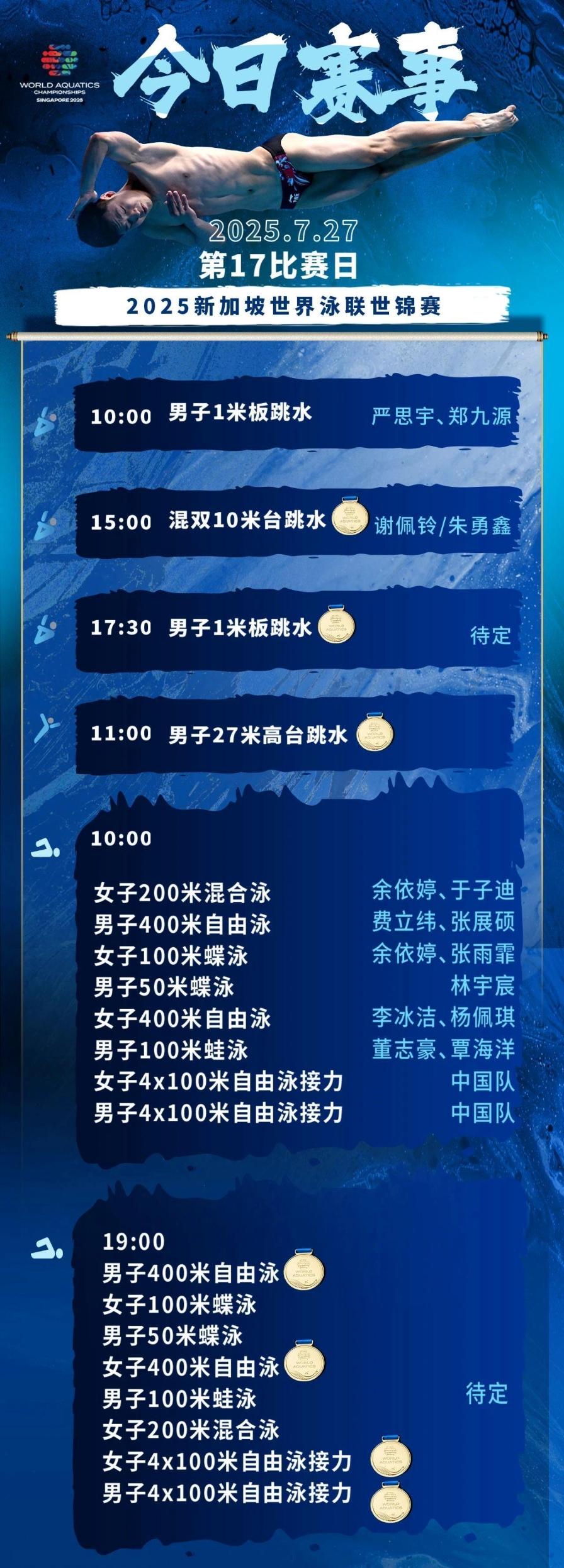 北京时间7月27日,2025年新加坡世界泳联世锦赛的游泳比赛正式开赛,在首个比赛日将会产生四枚金牌,包括李冰洁、张雨霏、潘展乐等多名中国名将今日悉数登场。
