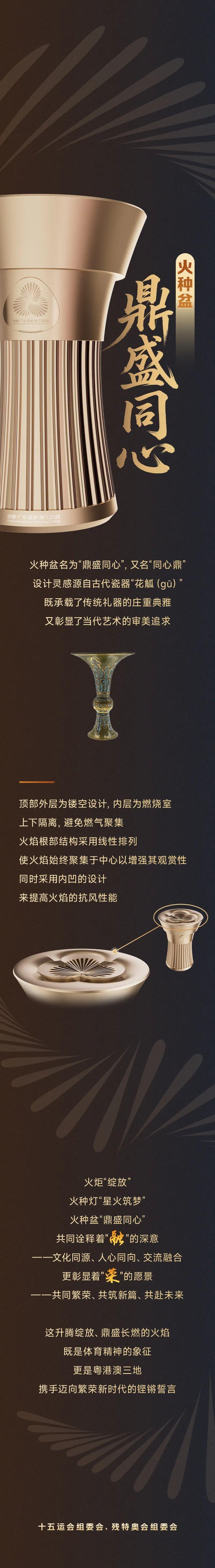俯瞰顶端焰口为“波浪”状会徽造型,彰显粤港澳大湾区勇立潮头、改革创新的精神,以及作为海上丝绸之路重要节点的历史底蕴;横看火炬以流线型金属为骨,在光影流转中呈现“礼花绽放”的动态美感;底部为牡丹纹印,不仅蕴含在祖国的关怀引领下,粤港澳三地“人心相通、团结奋进”的美好期许,也呼应了运动员在赛场上突破极限、勇攀高峰的昂扬姿态,象征着新时代中国体育事业蓬勃发展的万千气象,凝聚起现代化建设奋进新征程的磅礴力量。