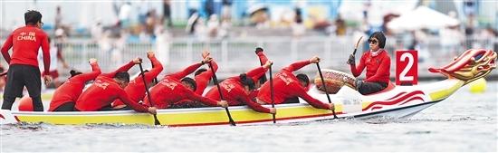 中国队在龙舟8人座公开组2000米追逐赛决赛中。新华社记者 李嘉南 摄