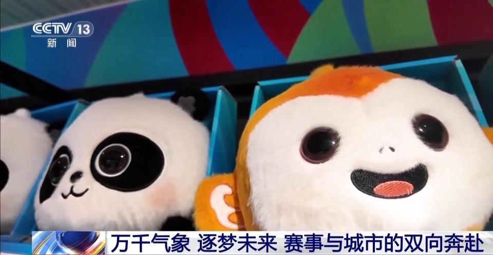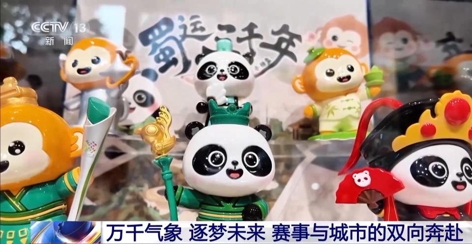 在这里,成都世运会的吉祥物蜀宝、锦仔不仅做成手办、盲盒、冰箱贴、徽章。