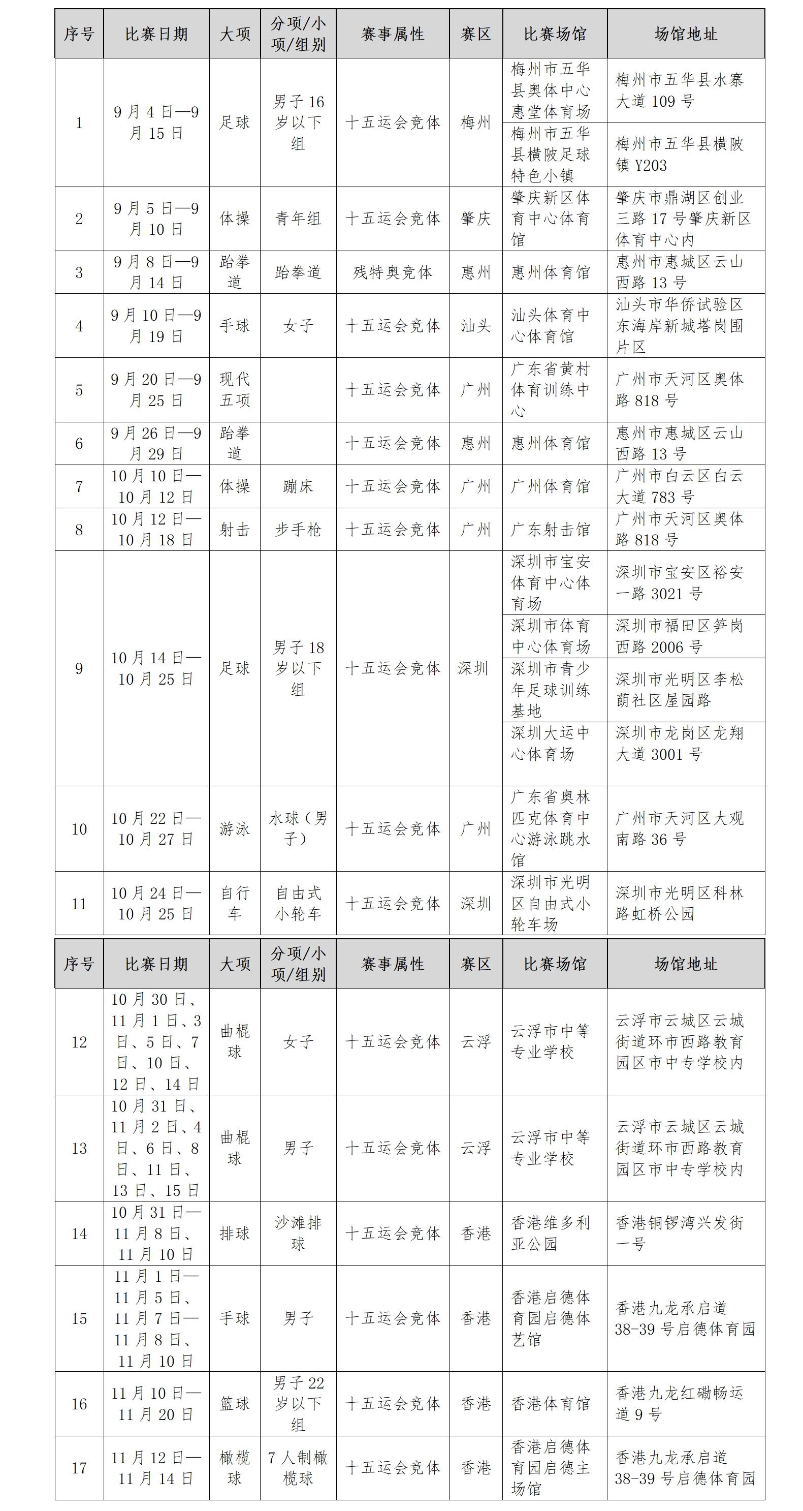 首批17个项目门票将于8月28日开售,从9月4日在梅州进行的足球对决到11月14日在香港启德体育园收官的7人制橄榄球比赛,覆盖广东、香港多地的多座场馆,赛程、场馆地址、赛事属性等信息一目了然。