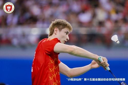 8月18日,江苏队石宇奇在第十五届全国运动会羽毛球资格赛中回球。(组委会供图)