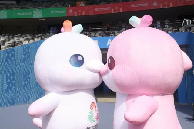 开幕式上,全国各支参赛队伍亮相,十五运会吉祥物“喜洋洋”“乐融融”(中华白海豚原型)登场与观众互动。