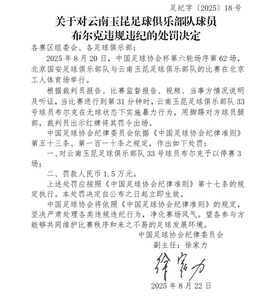 此外,在20日举行的足协杯半决赛北京国安7:0战胜云南玉昆的比赛中,布尔克犯规后被主裁判红牌罚下。中国足协表示,布尔克的犯规行为被认定为“在无球状态下实施暴力行为”,因此对他禁赛三场、罚款1.5万元。
