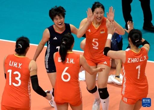 8月27日,中国队球员在比赛中庆祝得分。新华社发(卢炳辉摄)