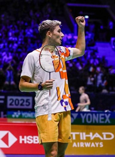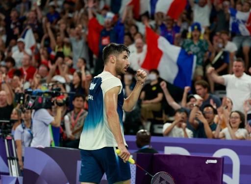 2024年7月31日,波波夫在比赛中庆祝得分。当日,在巴黎奥运会羽毛球项目男子单打小组赛H组比赛中,印度尼西亚选手金廷1比2不敌法国选手波波夫。新华社记者 任正来 摄